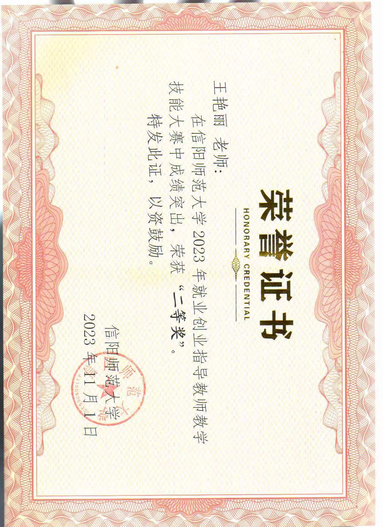 本次比赛重点考察课程实施效果和教师教学水平,通过教学大纲、教学设计、说课、模拟授课、专家提问等环节对选手进行综合考评。比赛过程中,王艳丽以先进的教学理念,新颖的教学设计,展示了出色的专业技能和扎实的教育教学基本功,彰显了我院就业创业指导教师的教育教学水平。经过激烈角逐,王艳丽荣获二等奖。