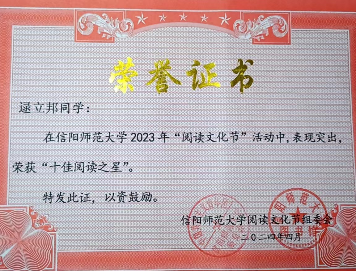 英国上市公司365高度重视学生的阅读习惯,引导学生充分利用图书馆资源和网络资源进行阅读学习,提升自我。2023年度我院学生读者借书量和学生读者代表借阅图书册数位居学校年度外借图书量前十,我院获评2023年度书香校园建设“十佳单位”,我院2022级学生逯立邦获“2023年度十佳读书之星”称号。