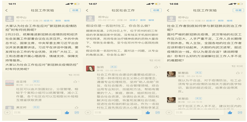 时间:2020-03-22 11:55 来源: 作者: 阅读: 次为贯彻落实学院新冠肺炎疫情期间“停课不停学”的要求,社会工作系祁中山、蔡瑾等老师充分利用网络教学平台与网上教学资源,精心设计课程的内容,采用速课、讨论互动、测验、课下作业等多种教学形式,开展专业课教学,保障了教学的效果和质量。