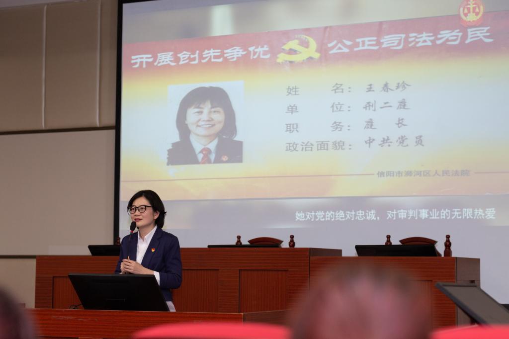 活动中播放了原浉河区法院党组成员、审委会委员、四级高级法官王春珍同志先进事迹专题片《点亮法治之光》。刘亚迪结合王春珍同志生前工作的珍贵图片深情宣讲了她坚守初心、司法为民,把青春和热血奉献给党的事业的英模事迹。大家无不为之动容,流下了感动的泪水。