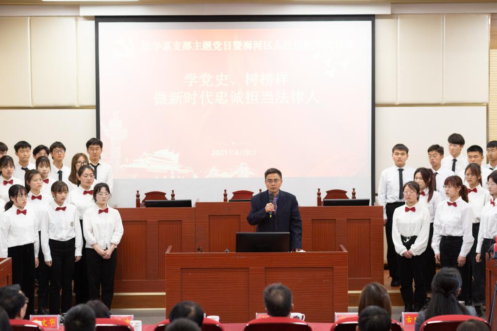 时间:2021-04-10 09:54 来源: 作者:古瑞华 刘文君 阅读: 次4月9日,法社学院法学系教工党支部“学党史,树榜样,做新时代忠诚担当法律人”主题党日活动在模拟法庭顺利举行。法社学院兼职教授、浉河区人民法院党组书记、院长祝杰,浉河区人民法院政治部主任杨瑛,浉河区委宣传部新闻中心副主任刘亚迪,法社学院党委中心组成员、法学专业教师及法律硕士研究生参加活动。法社学院党委委员、法学系教工党支部书记古瑞华教授主持党日活动。