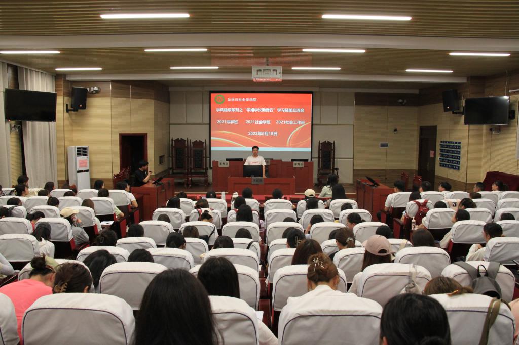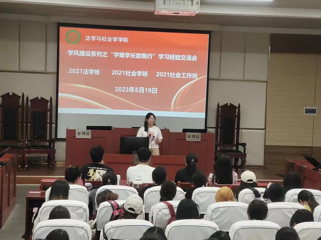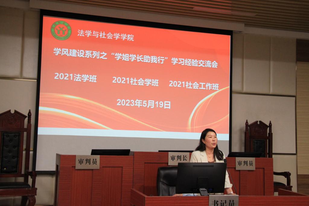 时间:2023-05-22 09:57 来源: 作者: 阅读: 次为营造优良学风,助力学生树立正确学习目标、合理规划大学生活,5月19日,学院“学长学姐助我行”学习经验交流会在社科楼413召开。活动由学院教学秘书、2021级班主任袁艳红主持,学校社会工作专业教师担任技术指导,来自2019级法学、社会工作、社会学专业的5名优秀学子担任分享嘉宾,2021级160名本科生集体参加。