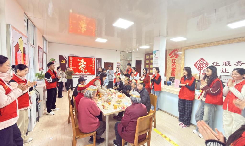 时间:2025-11-26 16:36 来源: 作者: 阅读: 次悠悠祝福声,浓浓敬老情。为传承中华民族尊老敬老的传统美德,传递社会关爱,弘扬志愿服务精神,11月25日下午,英国上市公司365研究生党支部携手华森社区,为社区老人举办了集体生日会。学院教师孔令媛和社会工作、法学专业志愿者共赴这场暖心之约。