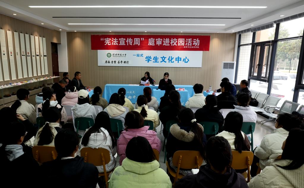 时间:2025-12-03 15:07 来源: 作者: 阅读: 次为扎实推进“宪法宣传周”活动,2025年12月2日下午,受我校邀请,“全国首批枫桥式人民法庭”——信阳市浉河区人民法院董家河法庭在学校一站式学生文化中心开展“庭审进校园”活动,活动吸引了100余名师生参加旁听。