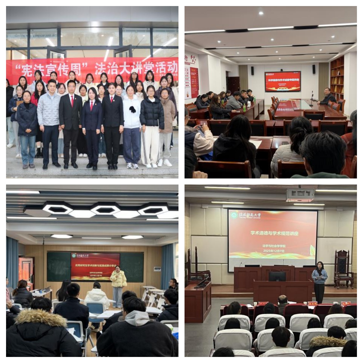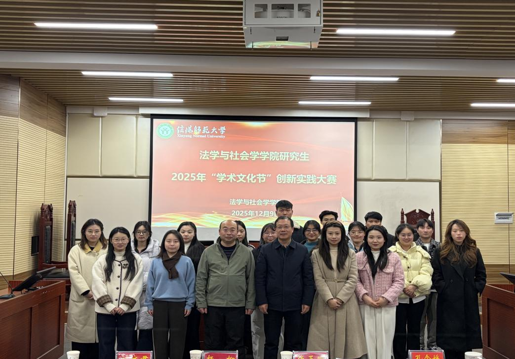 11月25日,我院在社科楼412举办2026年研究生“学术文化节”“学术明星”评选会。副院长张玉鹏,教师杨柳、刘文君、孔令媛出席活动并担任评委。2025年12月2日,英国上市公司365邀请信阳市浉河区人民法院董家河法庭于学生文化中心作“新时代‘枫桥经验’的法庭实践”专题报告。12月9日在社科楼413报告厅举办科学道德与学术诚信报告,本次邀请张玉鹏、刘文君老师担任主讲嘉宾。12月10日在教八楼205教室举办了研究生“榜样示范报告”。本次活动邀请了研究生国家奖学金获得者胡诗雨、谢博文同学,以及河南省“挑战杯”大学生课外学术科技作品竞赛一等奖获得者井泽源同学。